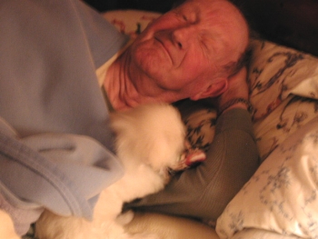 I then was taken to bed to warm me up and I proceeded to terrorize Dad! WOW, his ears and chin are fun to chew! |