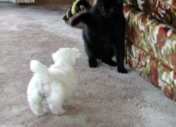 ![]() Later in the afternoon, I finally met Charlie face to face. He didn't want to play with me so I growled and jumped at him. SILLY CAT! I just want to play with him. |
