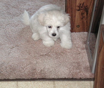 ![]() I tried to follow Mom everywhere; but for some reason, I am afraid of the hard cold kitchen floor. I just do not want to walk on it at all. |