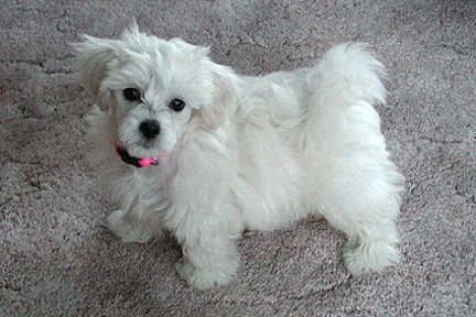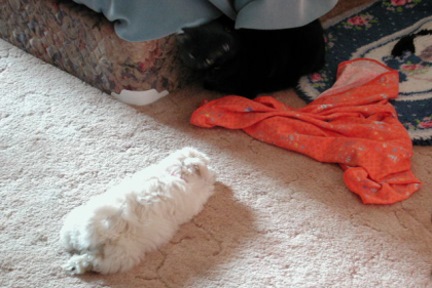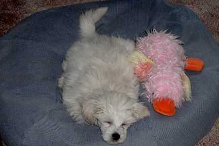 I am told that I am a real SCAMP and that I have short legs. What do you think? I sleep between Mom and Dad at night in the BIG people bed. Sometimes I even lay on their heads. Dad lacking hair sort of likes this as it keeps his head warm. Mom thinks it looks like Dad has a white toupee on and she laughed at us and woke us both up. How rude! |