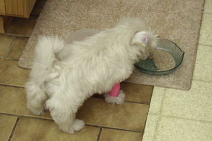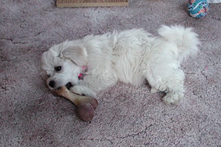 I'm on a very special diet for my tummy. It's called ID (Intestinal Diet). Mom is slowly adding more boiled hamburger and rice to it each day. I also get a special herb tea (Peppermint, spearmint and chamomile) and puppy replacement milk. The tea soothes my tummy and the puppy formula adds the calories that I need. The other day Mom made bean soup for Dad and Grandpa and she used a BIG ham bone to flavour the soup. She gave me the well-boiled and cleaned bone to chew on - WOW! Was that good, but, I wish she would have left some meat on it for me. Oh well, maybe next time when my tummy is all better. |