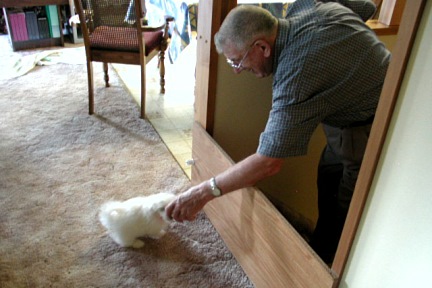 My Grandpa lives downstairs and do I ever love him. When he comes upstairs to visit or have his dinner, I rush to the gate at the top of the stairs and shake a paw with him. When he picks me up, I take it upon myself to wash his face especially before and after his dinner. I'm sure he appreciates it. He sure has BIG hands. I almost disappear when he holds me. |