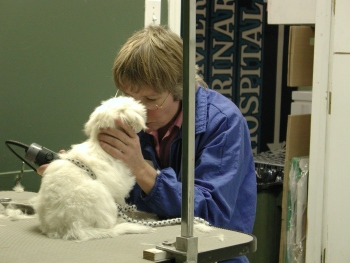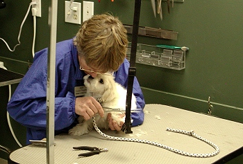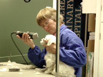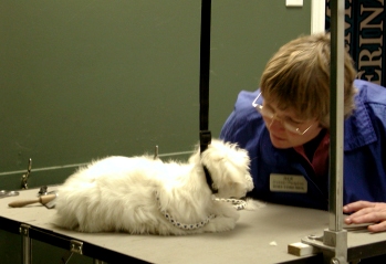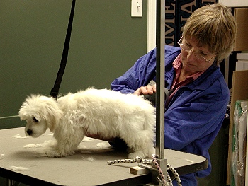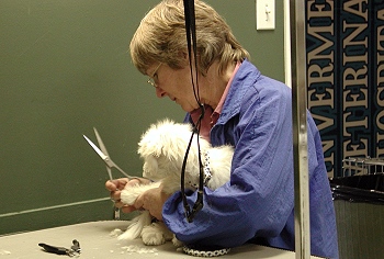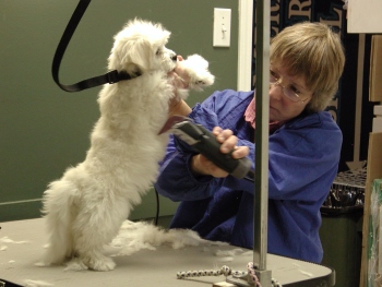 I was then driven to the Vet Clinic (I did not remember that place too fondly). I tried to be brave; but I was so scarred. Then, I met Judy my puppy groomer. She was really nice to me and we soon became good friends. I was still very nervous; but she promised me that she would take things slowly and that it wouldn't hurt at all. First, she clipped the hair on my paws. That was not too bad! |
