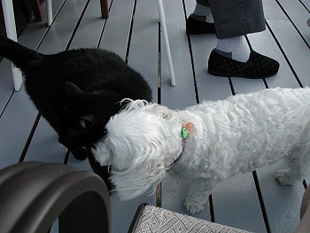 Charlie - Let me smell your breath to see if you have eaten another mouse. Did I ever tell you that Charlie brought me a mouse twice now. The first time Mom took it away from me but; the second time, I fooled her and swallowed it whole when she told me to spit it out. Oh! It was fuzzy and that long tail was hard to swallow. I wonder how Charlie eats those all the time? YUCK! |