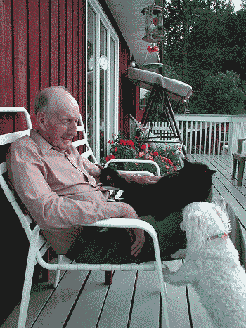 In the evenings, Dad, Mom, Charlie and I love to sit on our front deck. On these hot days an evening breeze feels so good even if it does blow my ears into my eyes.
