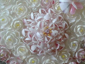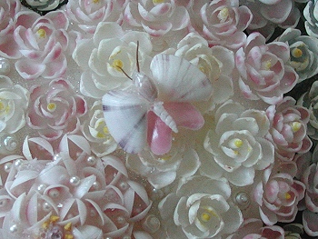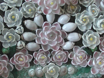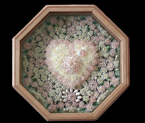 This is my first attempt to make a Sailor's Valentine. It took me many hours and approximately 2,600 shells to make this 10 inch valentine. The background for the main part is olivine sand which I collected from sand from Kauai. It was picked from thebeach sand one grain at a time. The flowers are made from crafting shells purchased over the years. The leaves are painted gar (fish) scales. Sailor's valentines originated during the whaling era as a romantic token from the sea that homesick sailors fashioned for their loved ones back home. Soon natives learned of these crafted tokens and started making them for the sailors to buy while in port. Antique valentines are a sought-after collectible while a growing number of artists continue the tradition, each adding a new dimension by virtue of their own particular styles. |